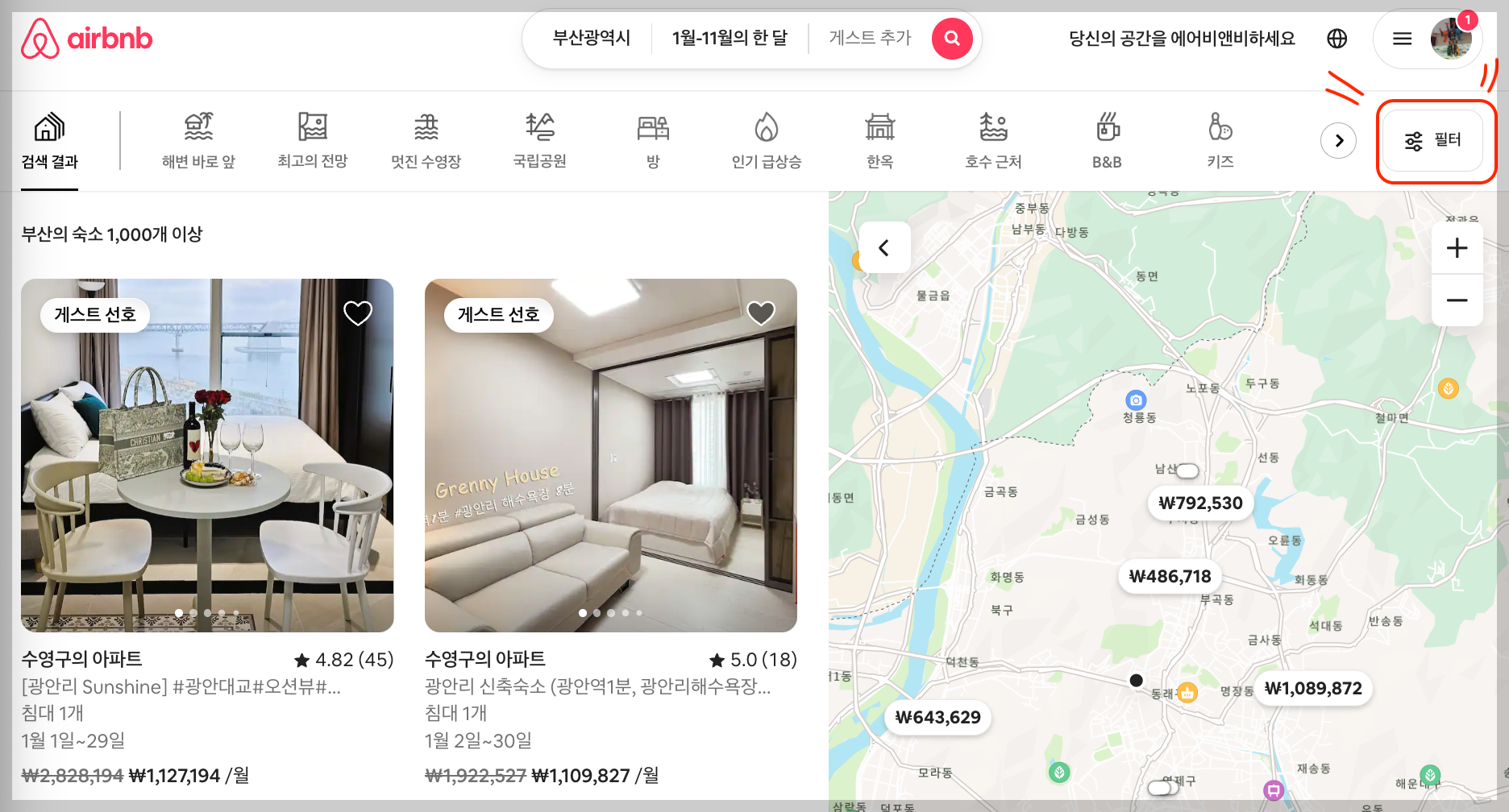 위의 에어비엔비에 접속을 하셨다면 목적지와 방문 예정일을 각각 입력해 줍니다. 그렇게 되면 정말 많은 숙소들이 쏟아지게 되는데 저는 "필터" 기능을 활용하는 것을 추천 드려요.