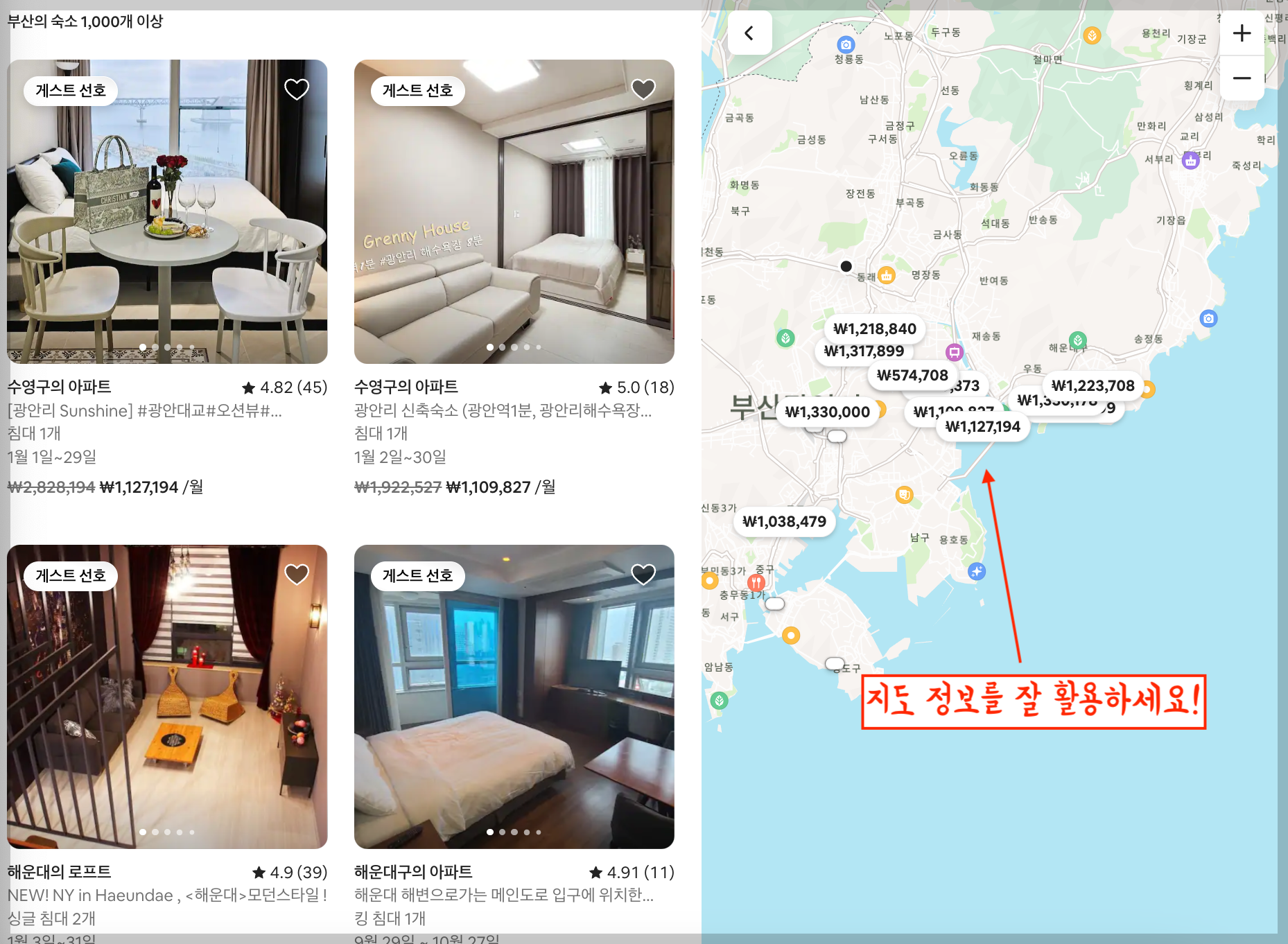 위의 방법으로 숙소를 필터링하게되면 결과값이 화면에 나오게되는데 지도를 잘 활용할 필요가 있습니다. 숙소는 여행 동선의 중심이 되기 때문에 방문할 주요 여행지의 위치를 잘 확인한 뒤 최종적으로 숙소를 선택하면 좋겠죠?