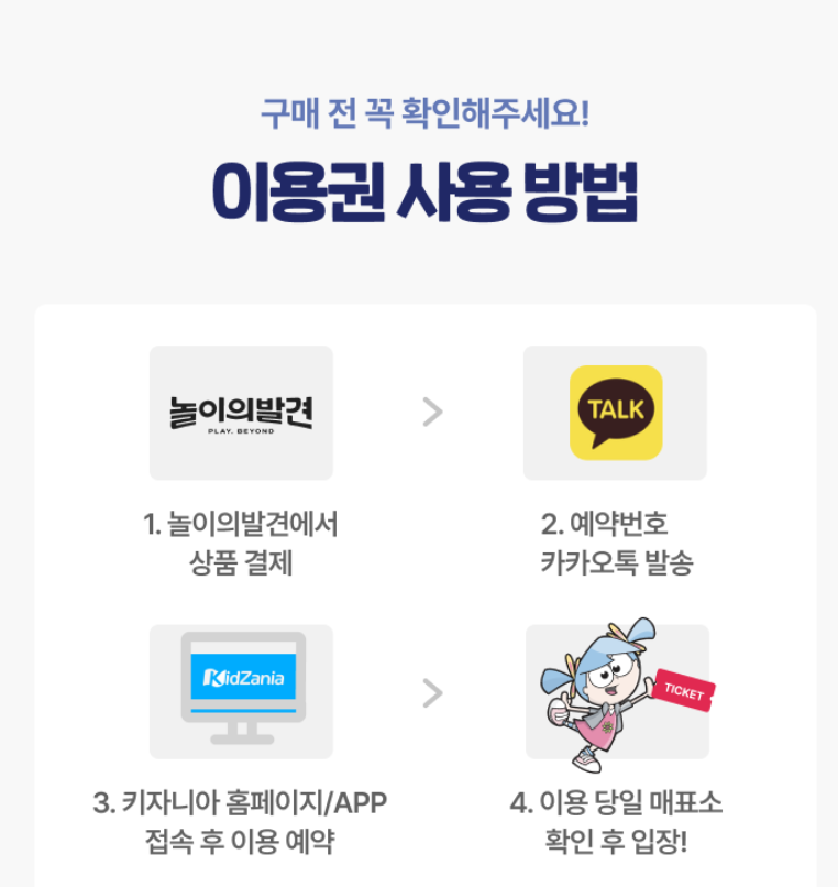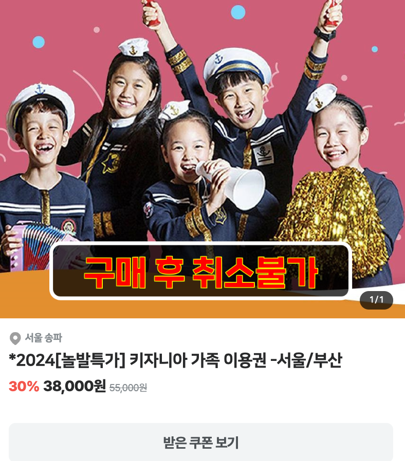 다만, 결제 완료 후에는 취소가 불가한 상품이니 신중하게 구매해야 하고 구매 후에는 반드시 키자니아 홈페이지에서 쿠폰 등록 및 이용일을 예약해 주어야합니다.